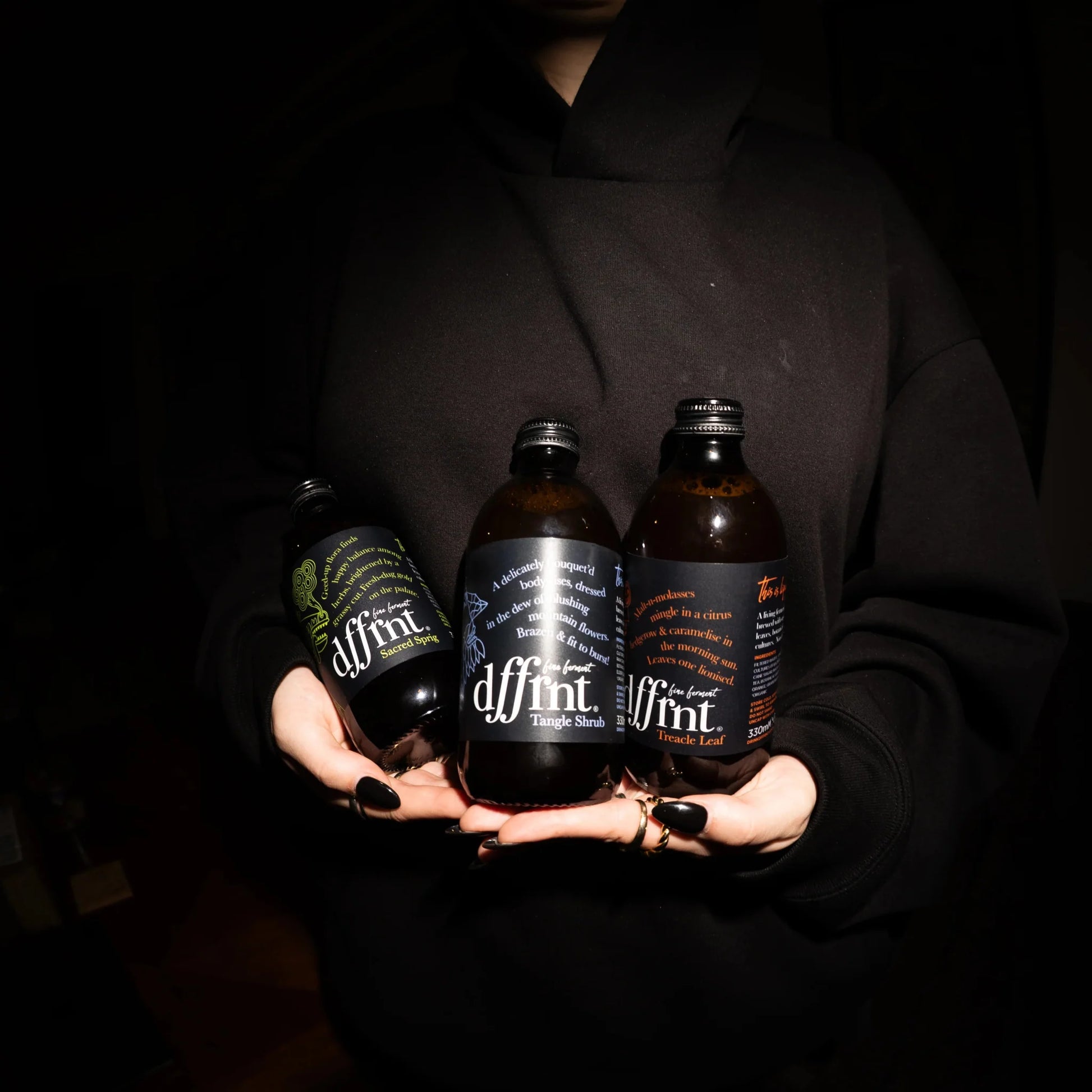 Sacred Sprig: filtered water, organic sencha botanicals (Agathosma betulina), raw cane sugar, SCOBY | Tangle Shrub: filtered water, organic sencha botanicals (jasmine, rose,elderflower), raw cane sugar, SCOBY | Treacle Loaf: filtered water, organic Pekoe and Yerba Mate and botanicals (bergamot, orange, grapefruit, black pepper), raw cane sugar, SCOBY