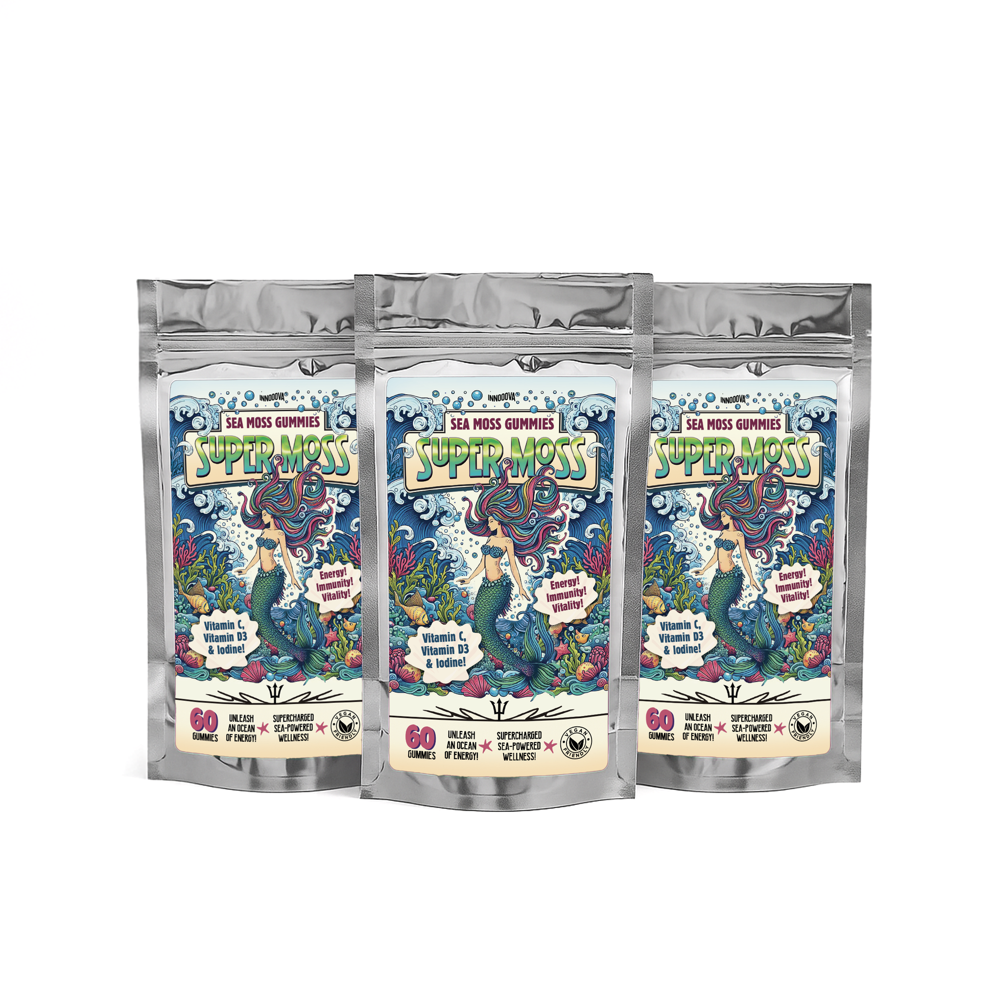 Dive into the nourishing power of the ocean with SuperMoss™ Sea Moss Gummies. Infused with Chondrus Crispus (Sea Moss), Vitamin C, Vitamin D3, and Iodine, these tasty apple-flavoured gummies are the ultimate sea-powered supplement to boost your daily vitality.