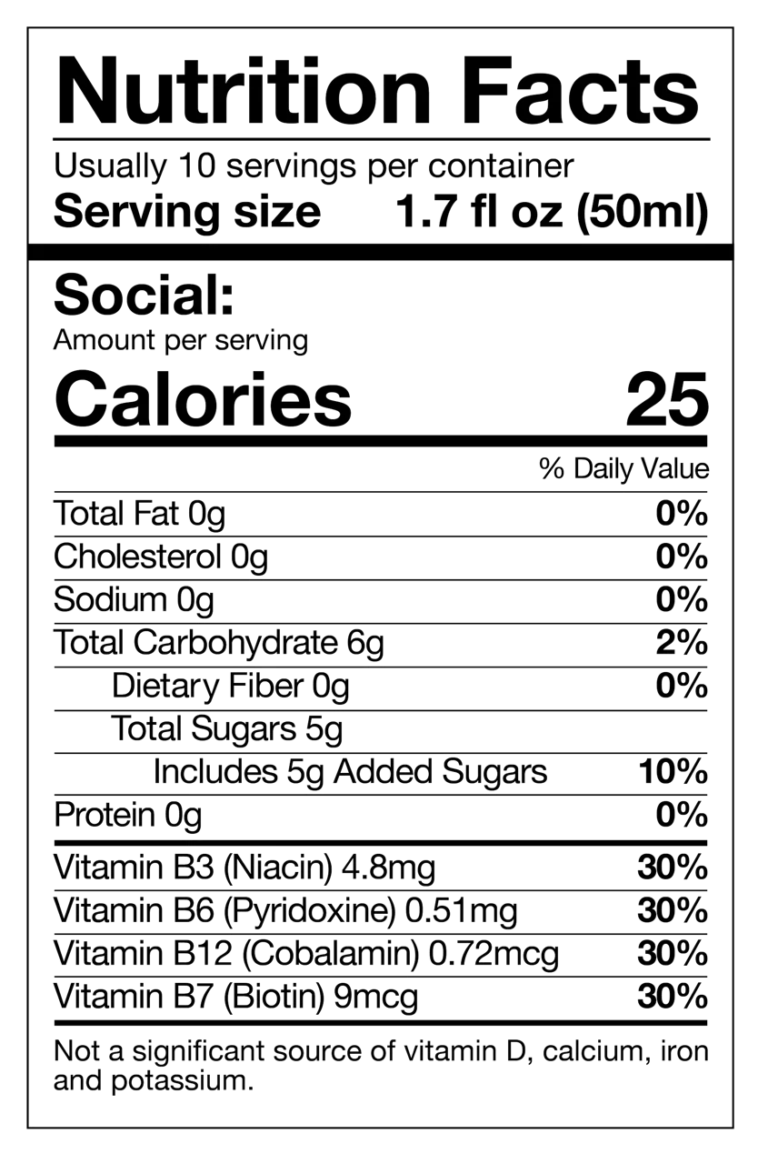 INGREDIENTS: Purified water, agave nectar, botanical extracts of; (damiana leaf, lion’s mane mushroom, yerba mate, passion flower, cacao bean, caraway, green tea), apple cider vinegar, blackstrap molasses, black carrot, acidity regulator: tartaric acid, potassium sorbate, vitamins; B3 (Niacin), B6 (Pyridoxine), B7 (Biotin), B12 (Cobalamin).